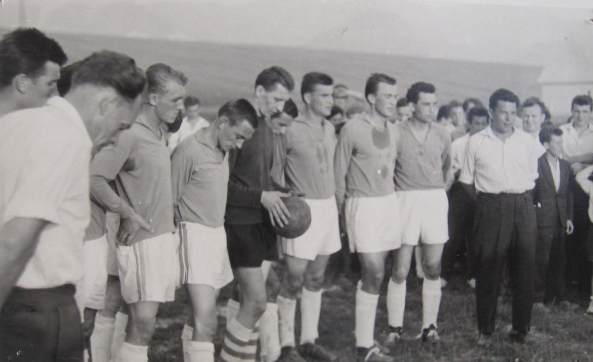 Rosinskí futbalisti na futbalovom turnaji vo Višňovom (1962).Zľava: Vladimír Kucharčík, Miloslav Turský, Štefan Hodas, Vladimír Beniač, Jozef Majtán, Vladimír Krajči, Karol Beniač, Anton Kotrbanec, Emil Trzuba, Dušan Gjabel, Albín Jaššo.