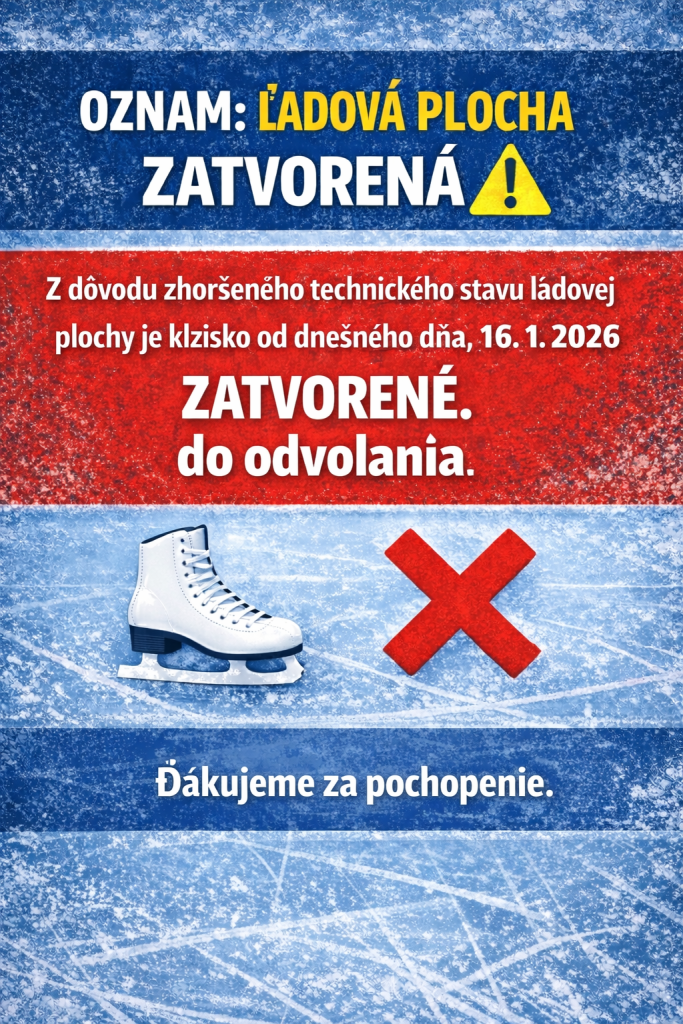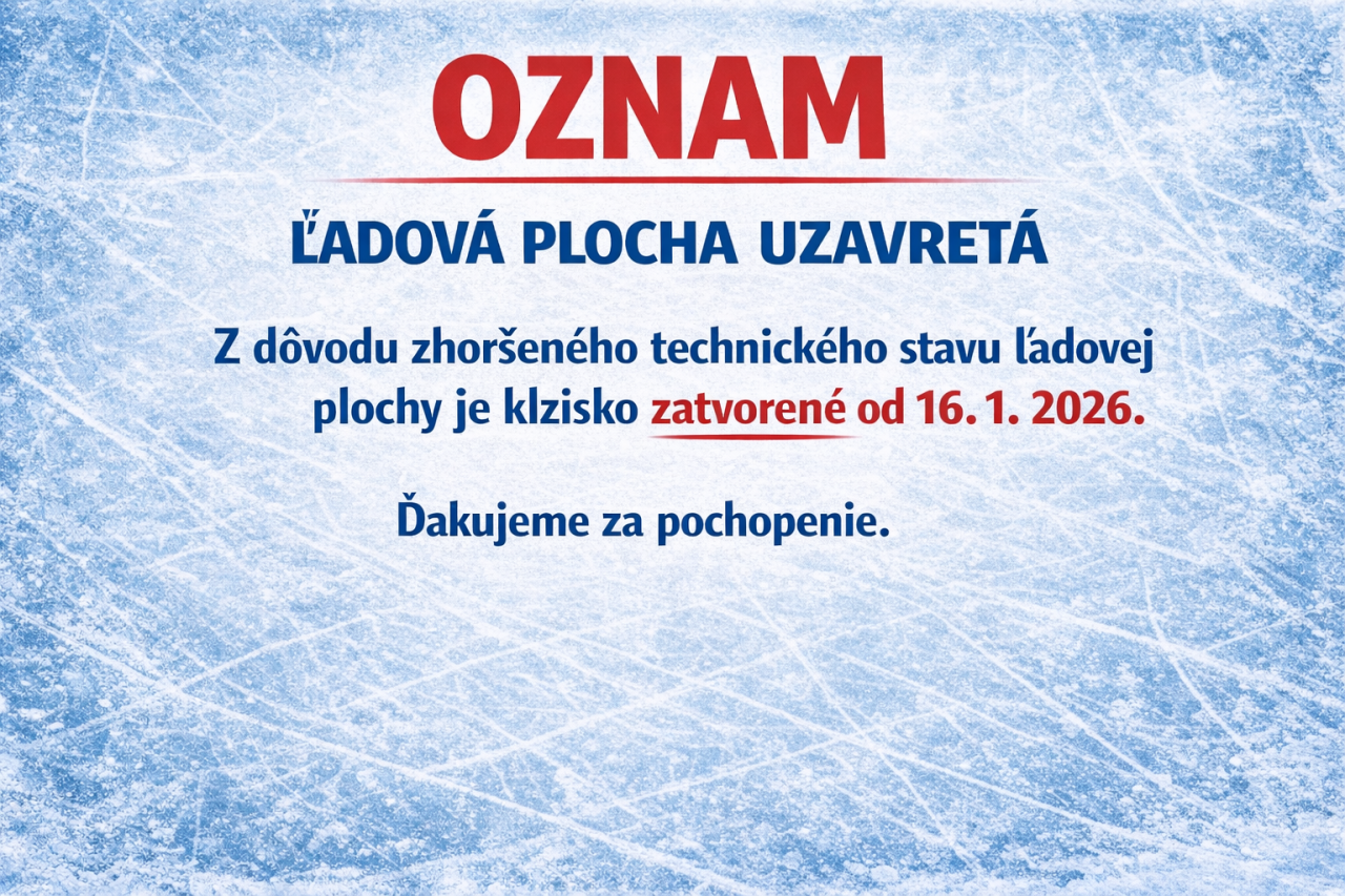 Z dôvodu zhoršeného technického stavu ľadovej plochy je klzisko zatvorené od 16. 1. 2026. O opätovnom otvorení budeme informovať po zlepšení poveternostných podmienok, najmä po ochladení. Ďakujeme za pochopenie.